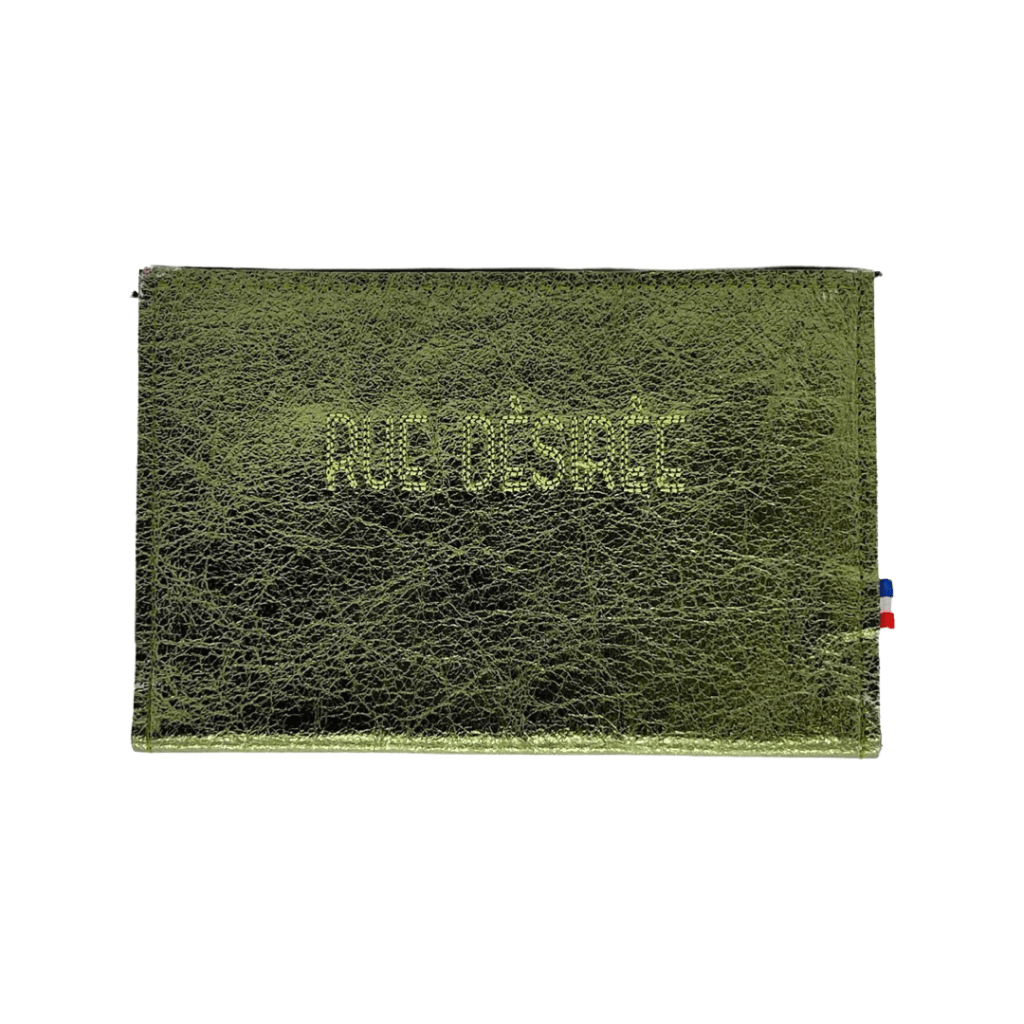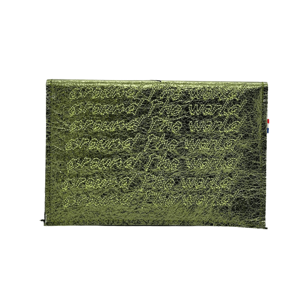 Cuir vert brillant avec la broderie du titre du célèbre morceau Around the World des Daft Punk.
