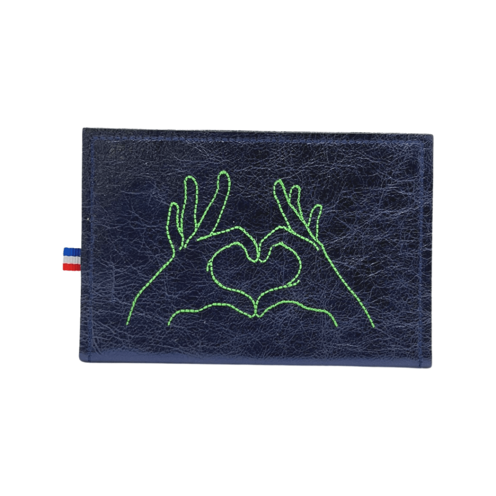 Cuir bleu nuit brillant avec la broderie de mains qui forment un coeur.