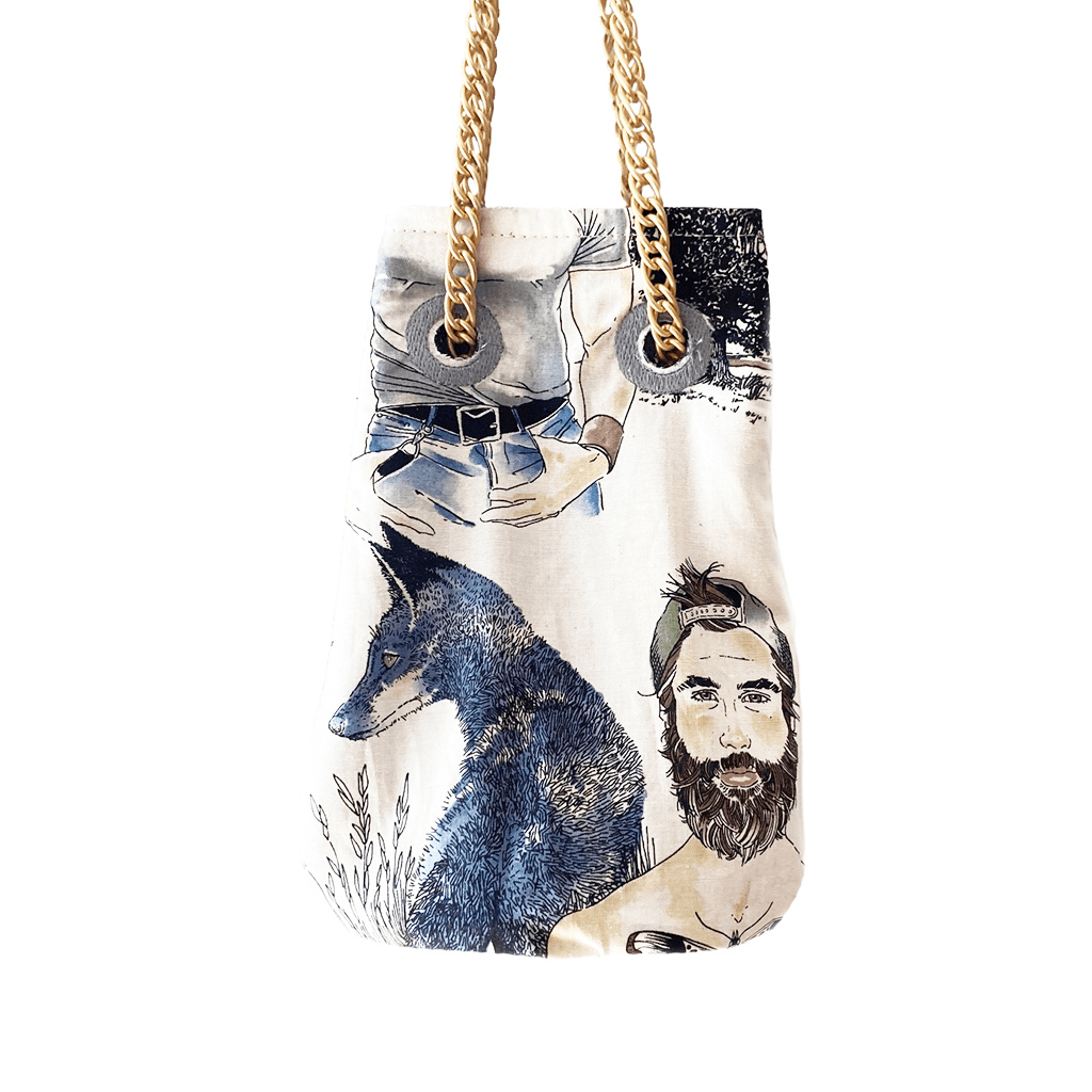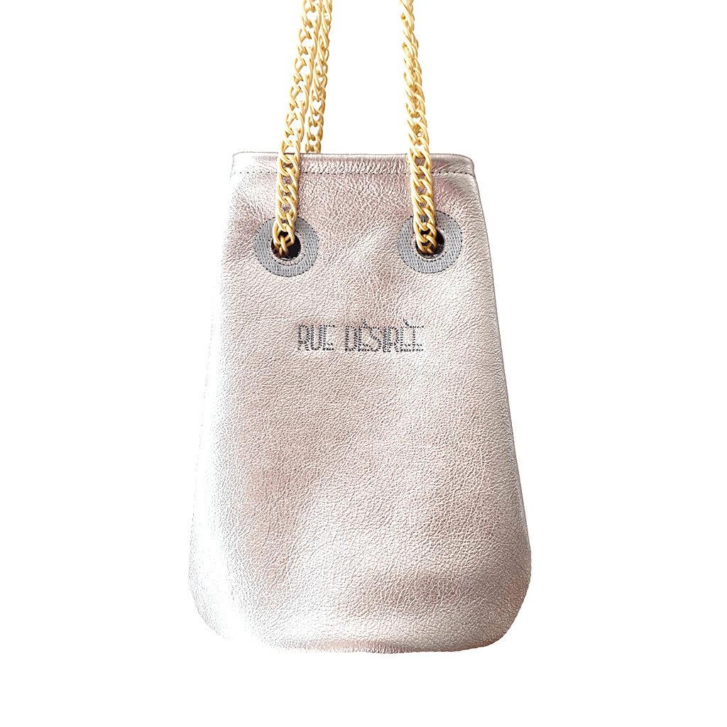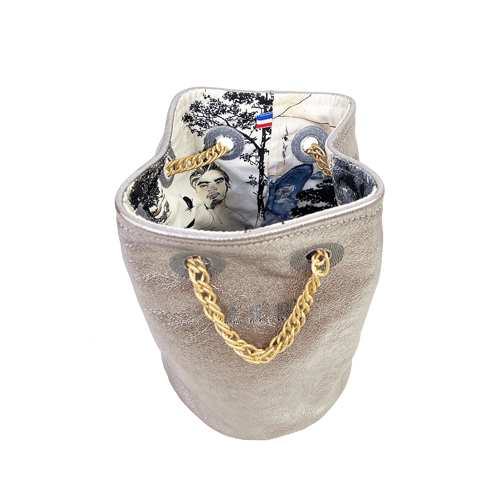 Sac seau en cuir de vache grainé, couleur argent brillant et lumineux. Sa doublure est en coton imprimé d’hommes version Pin Up. Un joli sac drôle et décalé, le détail qui fait baver!