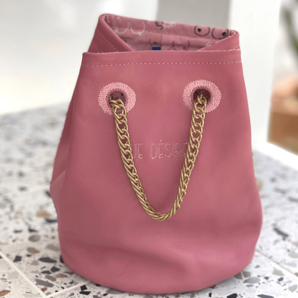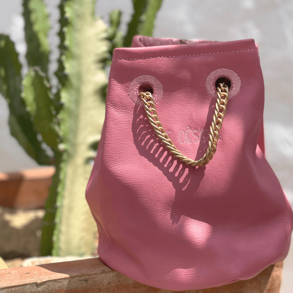 Le sac seau en cuir rose mat Tits Out à une contenance parfaite.